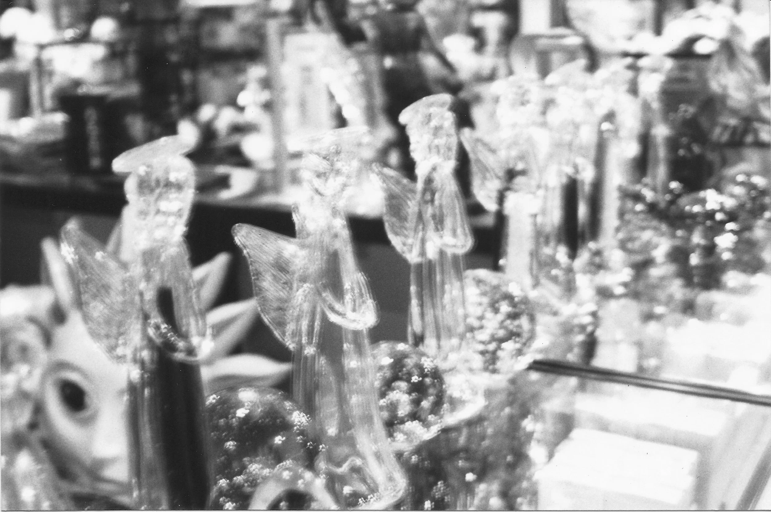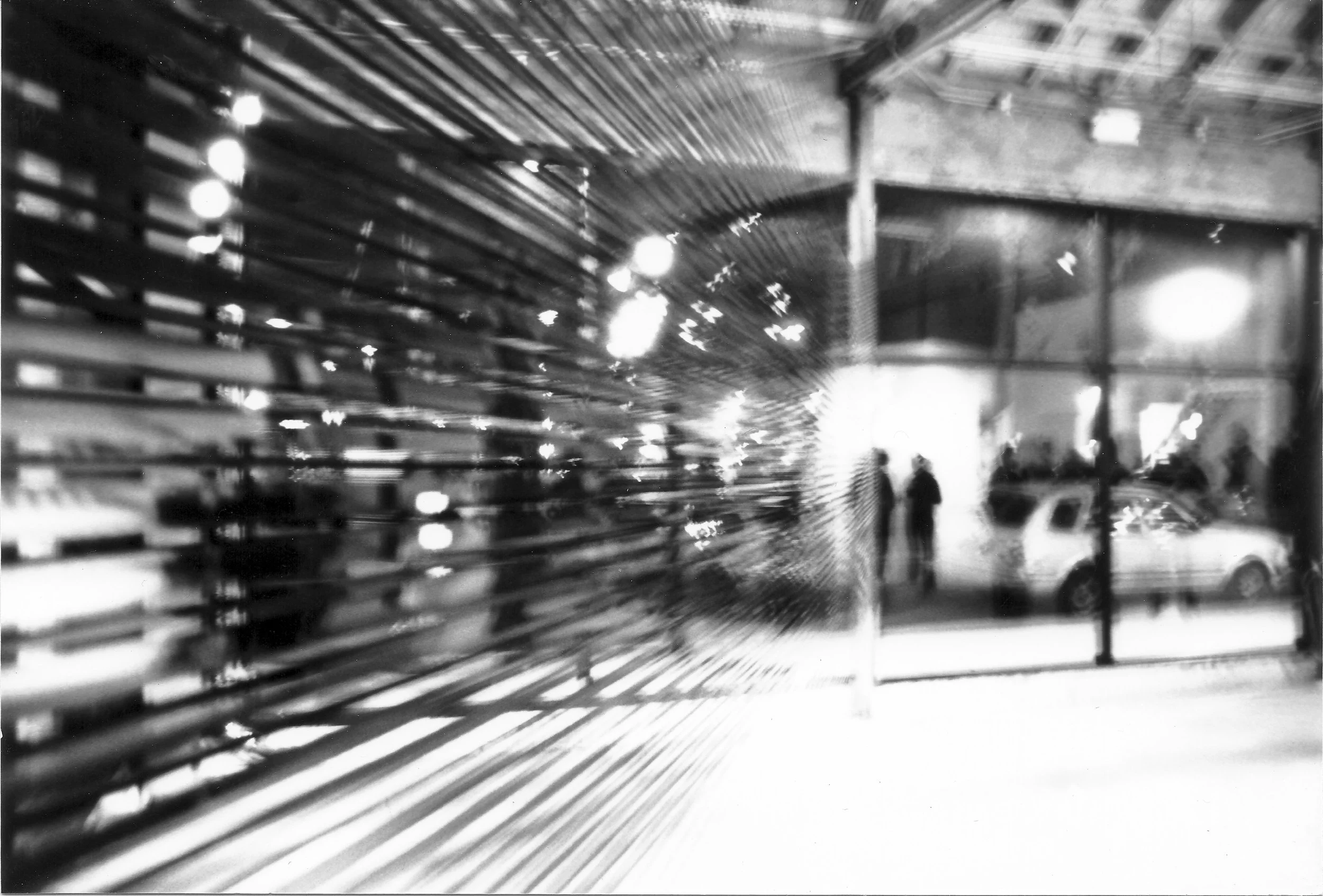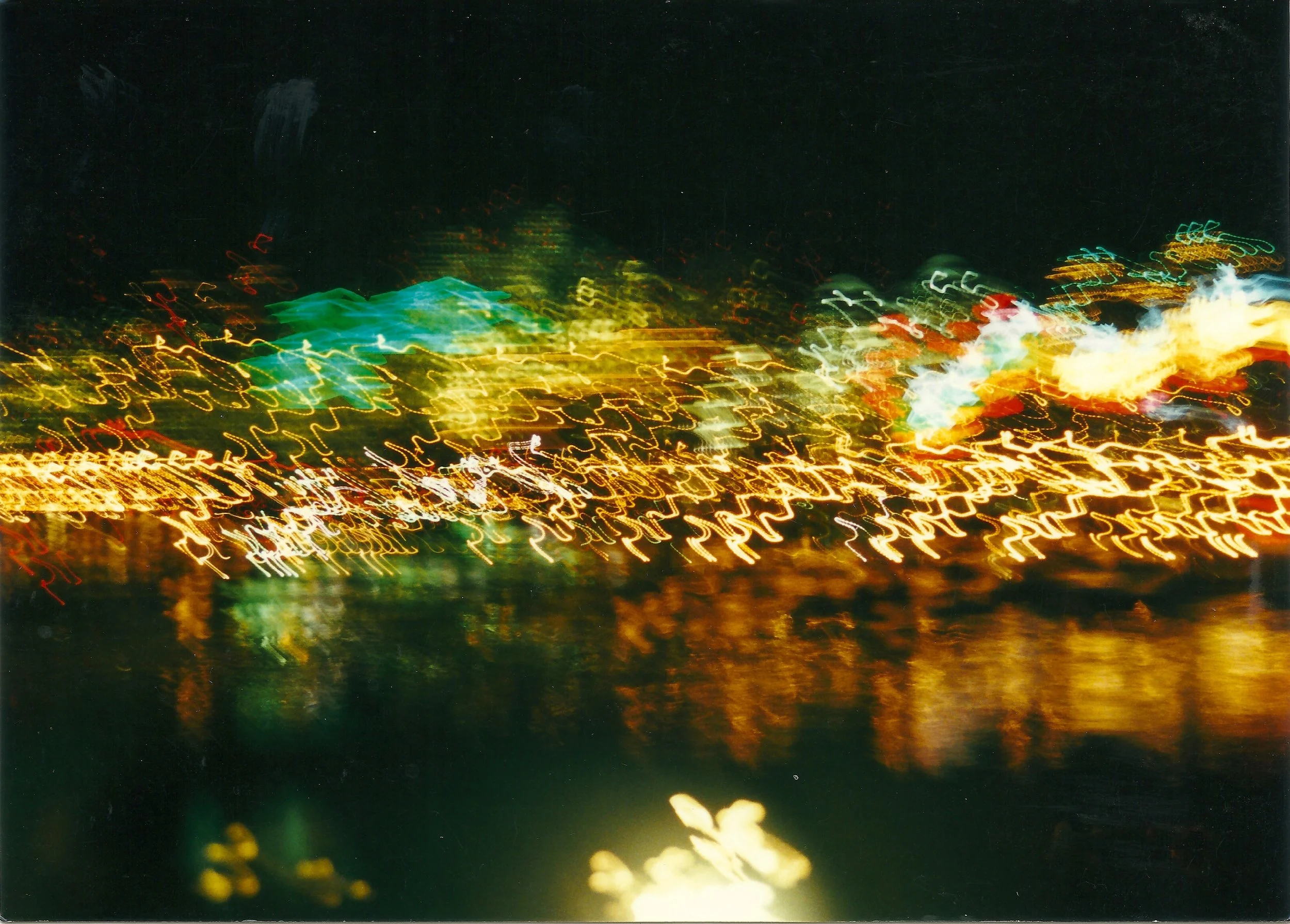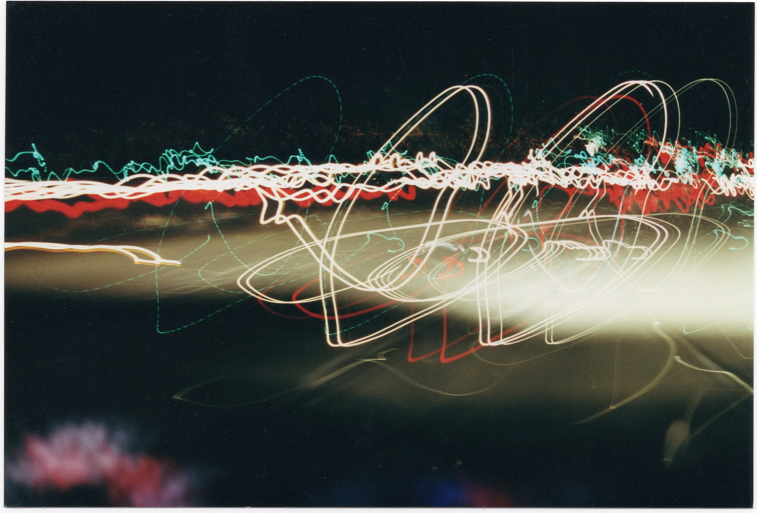 I was really into slow shutter speeds and shaking the camera while the shutter was open. This was taken at an intersection and the dashed turquoise light is alternating current and the solid red and white lights are direct current (AC/DC).